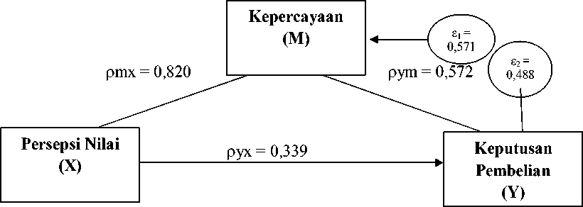 Persepsi nilai berpengaruh signifikan terhadap kepercayaan dengan nilai Standardized Coefficients Beta sebesar 0,572 dan nilai t sebesar 0,000 < 0,05. Nilai ε2 (error2) sebesar 0,488, sebesar 48,8 persen variasi di sebabkan oleh variabel di luar model.