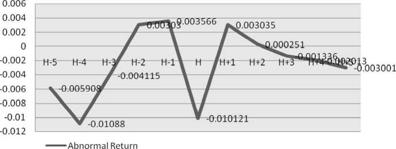 H-1, H+1 dan H+2, sedangkan abnormal return negatif diperoleh pada H-5, H-4, H-3, hari H, H+3, H+4 dan H+5