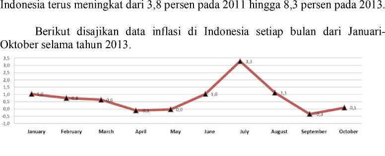 Berdasarkan Gambar 2 dapat dilihat bahwa pada Juli 2013, inflasi Indonesia tercatat sebagai inflasi tertinggi di Indonesia selama Inflasi 2013. Di Indonesia pada Juli 2013 mencapai 3,3 persen, tercatat juga sebagai inflasi tertinggi dialami Indonesia sejak tahun 2011. inflasi Indonesia dalam periode ini juga dicatat sebagai inflasi tertinggi di antara negara-negara anggota ASEAN selama periode 2013. Ketika implementasi kebijakan pemerintah menaikkan harga BBM pada akhir Juni 2013, tingkat inflasi juga meningkat pada bulan Juli sampai Agustus 2013. Tingkat inflasi Indonesia pada Agustus 2013 adalah 1,1 persen, sementara pada bulan September 2013 Indonesia mengalami deflasi sebesar 0,4 persen. Pada bulan Oktober 2013, inflasi mencapai 0,1 persen.