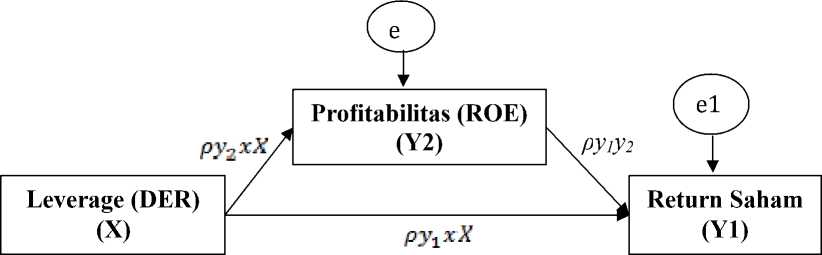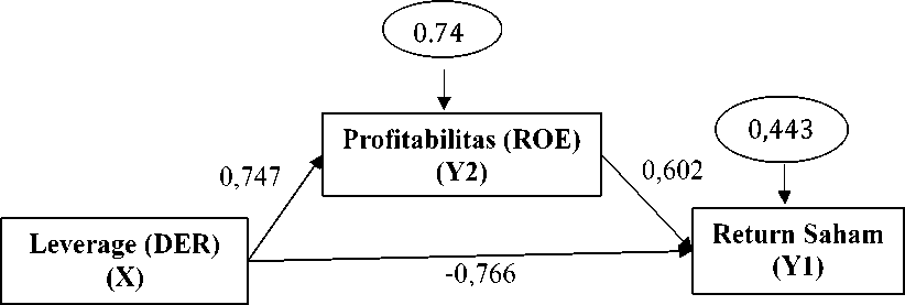 Ratio (DER) meningkat sebanyak 1 persen maka akan mengakibatkan penurunan terhadap Return Saham sebesar -0.766 persen.Nilai ρy1y2 sebesar 0.602 memiliki arti bahwa Return On Equity (ROE) berpengaruh positif terhadap return saham, dengan kata lain jika Return On Equity (ROE) meningkat sebesar 1 persen maka akan mengakibatkan return saham yang diperoleh investor meningkat sebesar 0.602