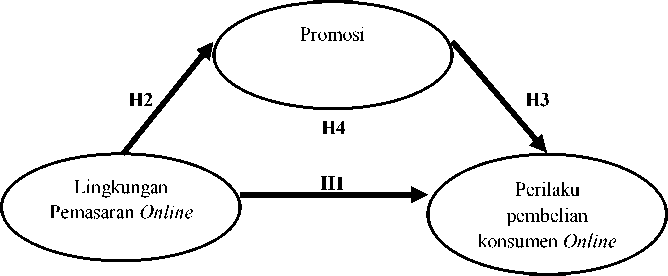 Berdasarkan hipotesis kedua yaitu lingkungan pemasaran online berpengaruh positif dan signifikan terhadap promosi, serta hipotesis ketiga yaitu promosi berpengaruh positif secara signifikan terhadap perilaku pembelian konsumen online, maka dari itu dapat diduga bahwa promosi memediasi lingkungan pemasaran online terhadap perilaku pembelian konsumen online. Maka dapat diambil hipotesis: