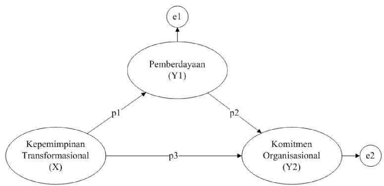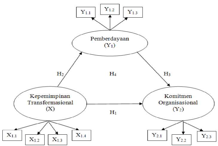 Kepemimpinan transformasional (X) terhadap komitmen organisasional (Y2) melalui pemberdayaan (Y1) |