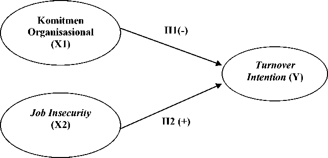 Gunalan dan Adnan (2015) menunjukkan bahwa job insecurity memiliki pengaruh positif terhadap turnover intention. Hanafiah (2014) juga mendapatkan hasil penelitian serupa yang menyatakan bahwa ketidakamanan kerja memiliki hubungan yang positif dengan turnover intention. Hasil penelitian Donald (2008) menerangkan semakin tinggi job insecurity menyebabkan rendahnya komitmen organisasional, dan kemudian menyebabkan tingginya keinginan berpindah kerja. Hasil penelitian Utami (2009) mengungkapkan bahwa semakin tinggi job insecurity akan menyebabkan rendahnya komitmen organisasional, dan kemudian menyebabkan tingginya keinginan berpindah kerja. Penelitian Sora et al. (2010) yang menyatakan bahwa ketidakamanan bekerja memiliki pengaruh positif dan signifikan terhadap turnover intention. Peneliti Mizar (2008) juga menyatakan bahwa terdapat pengaruh antara job insecurity dengan intensi pindah kerja karyawan, karena job insecurity yang terjadi secara terus menerus akan mempengaruhi kondisi psikologis karyawan. Jika masalah rasa tidak aman dalam bekerja terus menerus dihadapi karyawan, maka akan menstimulasi munculnya keinginan untuk berpindah kerja atau intensi turnover. Berdasarkan latar belakang dan pokok permasalahan yang diuraikan, maka dapat dikemukakan hipotesis sebagai berikut.