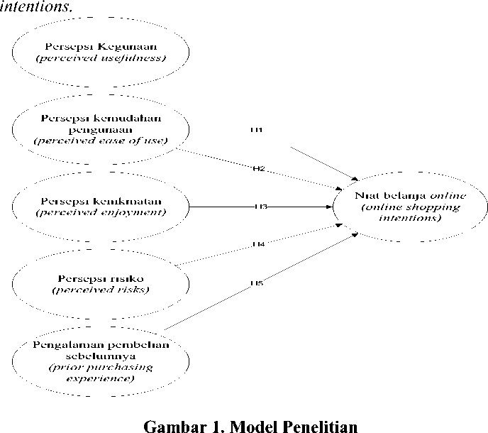 dalam kegiatan online shopping yaitu perceived ease of use, perceived usefulness, perceived enjoyment dan perceived risk yang dikaitkan dengan prior online shopping experience dan online shopping intention.