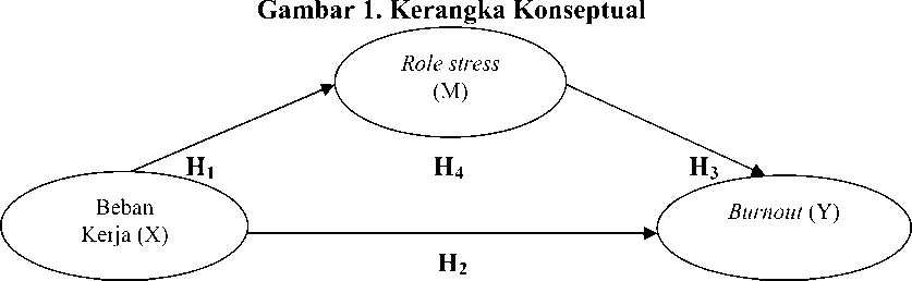 Penelitian Eka (2015) membuktikan bahwa terdapat pengaruh beban kerja dengan burnout pada karyawan. Hal ini sama dengan penelitian Hanna (2015) beban kerja dengan burnout memiliki pengaruh saling berhubungan positif. Dipertegas oleh Johanaet al. (2007) beban kerja memiliki pengaruh terhadap burnout pada diri karyawan. Rajan et al. (2016) menegaskan role stress sebagai variabel mediasi memberikan pengaruh pada hubungan positif beban kerja dengan burnout. Syed (2014) sebagai pendukung role stress mampu memediasi pengaruh