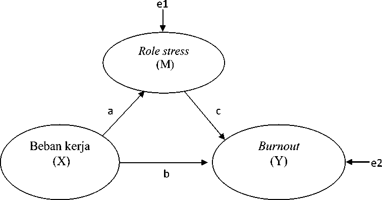 Pengaruh beban kerja (X) terhadap burnout (Y) ditunjukkan oleh koefisien jalur b, pengaruh langsung beban kerja (X) terhadap role stress (M) diperlihatkan oleh koefisien jalur a, dan pengaruh burnout (Y) terhadap role stress (M) diperlihatkan oleh koefisien jalur c. Pengaruh tidak langsung beban kerja (X) terhadap role stress (M) diperoleh dengan mengalikan a dan b.