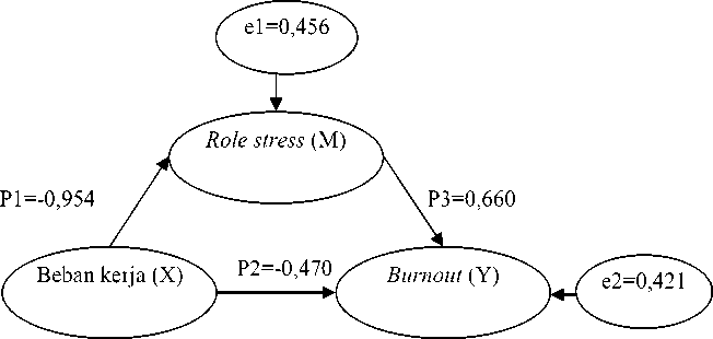 Berdasarkan hasil dari koefisien jalur pada hipotesis penelitian, maka dapat digambarkan hubungan kausal antar variabel pengaruh pengaruh beban kerja terhadap variabel burnout melalui role stress sebagai variabel mediasi. Perhitungan pengaruh antar variabel dirangkum dalam Tabel 7.
