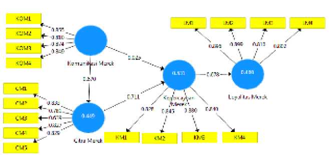 Tabel 14. juga memberikan informasi bahwa variabel komunikasi merek tidak berpengaruh signifikan terhadap variabel kepercayaan merek dan variabel kepercayaan merek berpengaruh signifikan terhadap variabel loyalitas merek, namun terdapat hubungan tidak langsung antara variabel komunikasi merek dengan loyalitas merek yang signifikan karena nilai P-Values lebih kecil dari 0,05. Dengan demikian dapat disimpulkan bahwa variabel kepercayaan merek dapat memediasi pengaruh variabel komunikasi merek terhadap loyalitas merek.