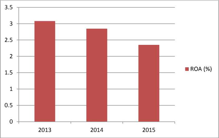 Gambar 1. menunjukkan bahwa ROA bank umum pada periode 2013-2015 sudah memenuhi nilai minimum yang ditetapkan oleh Bank Indonesia, yaitu sebesar 1,5 persen. Pada tahun 2013, nilai Return On Asset bank umum sebesar 3,08 persen, pada tahun 2014 turun menjadi 2,85 persen, dan pada tahun 2015 turun menjadi 2,35 persen.
