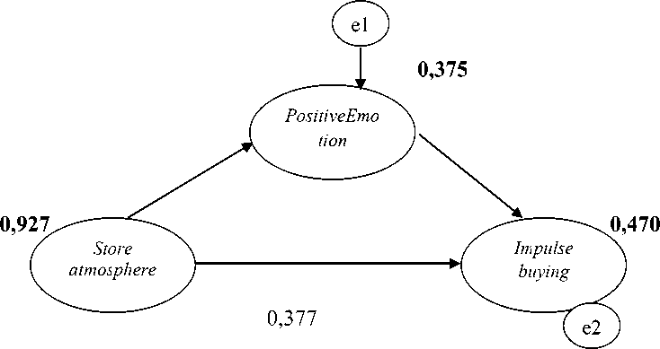 Berdasarkan Tabel 10. diatas, dapat diketahui bahwa Store atmosphere berpengaruh langsung terhadap Positive emotion, yaitu dengan signifikansinya sebesar 0,000 atau kurang dari satu persen. Namun variabel Store atmosphere tidak berpengaruh nyata terhadap Impulse buying dengan signifikansi sebesar 0,013. Sedangkan variabel Positive emotion berpengaruh langsung terhadap Impulse buying, yaitu dengan signifikansinya sebesar 0,002 atau kurang dari satu persen.