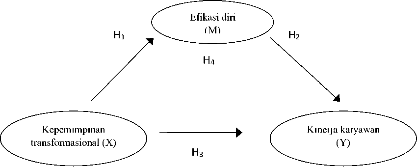 tinggi. Sebaliknya, tingkat efikasi diriyang lebih tinggi dari kepemimpinan transformasional akan memotivasi karyawan sehingga berpengaruh signifikan terhadap kinerja karyawan. Hasil penelitian Harjono (2015) menunjukkan kepemimpinan transformasional berpengaruh positif dan signifikan terhadap kinerja karyawan yang dimediasi oleh efikasi diri.