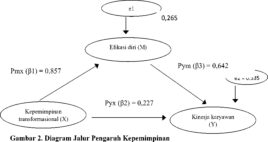 Hasil analisis jalur menunjukkan bahwa kepemimpinan transformasional dapat berpengaruh langsung ke kinerja karyawan dan dapat juga berpengaruh tidak langsung yaitu dari kepemimpinan transformasional ke efikasi diri (sebagai variabel atau intervening) lalu ke kinerja karyawan.