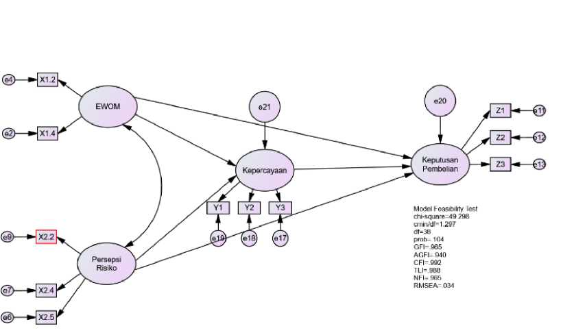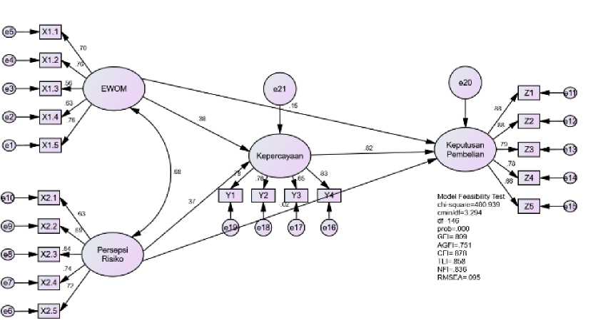 risiko berpengaruh secara signifikan terhadap kepercayaan Tokopedia, variabel E-WOM tidak berpengaruh secara signifikan terhadap keputusan pembelian Tokopedia, persepsi risiko tidak berpengaruh secara signifikan terhadap keputusan pembelian Tokopedia, dan kepercayaan berpengaruh secara signifikan terhadap variabel kepercayaan Tokopedia.