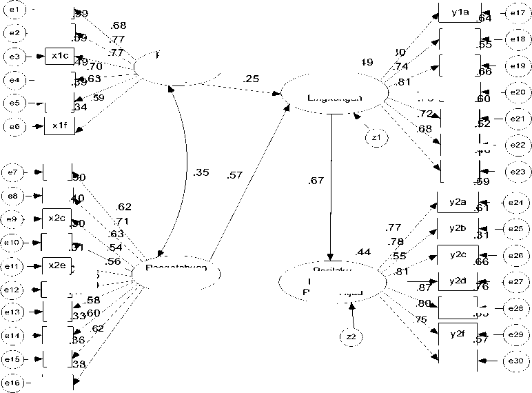Hasil pengujian, menunjukkan bahwa nilai Chi-square (441,459≤469,81), Probability (0,080≥0.05), CMIN/DF (1,101≤2,00), TLI (0,969≥0,95), CFI (0,972≥0,95), RMSEA (0,031≤0,80) telah memenuhi kriteria goodness of fit yang telah ditetapkan. Namun meskipun demikian, nilai GFI (0,784) dan AGFI (0,749) berada di bwah nilai cut-off value yang telah ditentukan (≤0,90), namun masih dalam batas toleransi (marginal) sehingga model ini dapat dikatakan fit dan tidak perlu adanya modifikasi model.