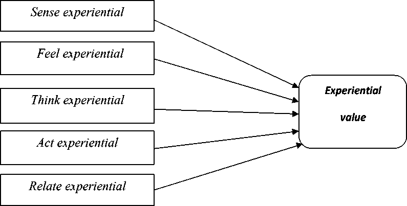 Maghnati, et.al (2012) , menegaskan bahwa sense experiential, feel experiential, think experiential, act experiential dan relate experiential berhubungan positif dengan experiential value di industri smartphone di Malaysia. Chandra dan Subagio (2013) menemukan dimensi sense memiliki pengaruh secara dominan terhadap perceived value.