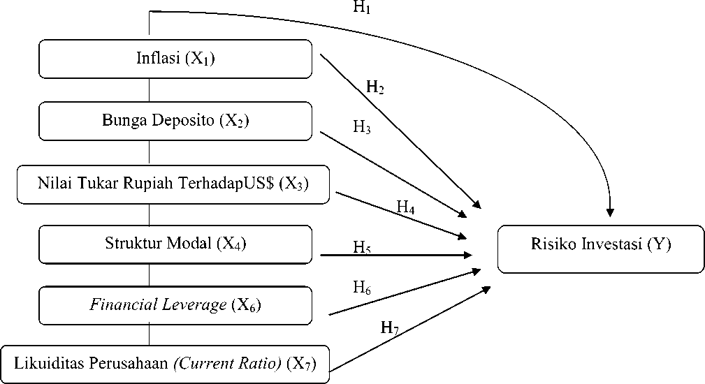 mereka. Menurut penelitian yang dilakukan oleh Aliya (2002), nilai tukar rupiah terhadap US$ berpengaruh positif dan signifikan terhadap risiko investasi saham. Hasil penelitian yang sama dilakukan oleh Suaradana (2012) yang menemukan bahwa nilai tukar rupiah terhadap US$ memiliki pengaruh secara positif dan signifikan terhadap risiko investasi saham. Berdasarkan atas kajian teori serta hasil penelitian sebelumnya, maka dirumuskan hipotesis sebagai berikut: