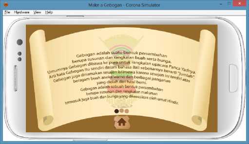 Gambar 4 menggambarkan Gebogan scene dari aplikasi Game Membuat Gebogan yang berfungsi sebagai scene penyaji materi dari aplikasi Game Membuat Gebogan. Gebogan scene berisi ulasan tentang pengertian Gebogan, sejarah Gebogan dan gambaran sederhana dari Gebogan. Player disajikan materi dalam bentuk text dengan backsound musik Bali yang memberi kesan tradisional sehingga player mengetahui bahwa Gebogan adalah salah satu kebudayaan Bali.