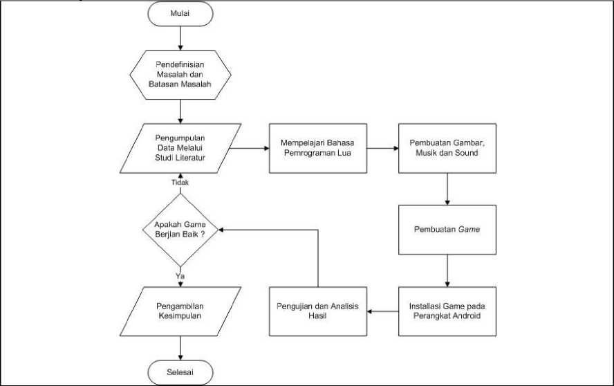 Alur penelitian pada Gambar 1 dimulai dari mendefinisikan masalah dan batasan masalah. Tahap kedua adalah pengumpulan data melalui studi literatur, tahap ketiga adalah mempelajari Bahasa Pemrograman Lua, kemudian proses pembuatan asset gambar, musik, dan backsound pendukung Game. Tahap kelima adalah pembuatan Game. Tahap keenam adalah proses instalasi game pada perangkat Android. Kemudian game diuji dan dianalisa hasilnya, jika game berjalan dengan baik, maka game layak untuk digunakan.