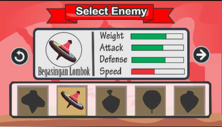 Select Character Enemy pada Gambar 7 merupakan tampilan dimana user dapat memilih karakter dari musuh untuk dilawan bertarung. Select Character Enemy berisikan 5 buah karakter dari Gasing yang memiliki kekuatan (Power), serangan (Attcak) dan pertahanan (Defense) yang berbeda-beda.