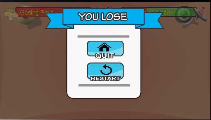 Game Over pada Gambar 9 berisikan beberapa objek sperti pada tampilan Game Play, namun pada Game Over berisikan beberapa objek tambahan yakni tampilan gambar tulisan you lose. Tampilan Game Over muncul ketika karakter gasing user kalah melawan karakter gasing musuh yang ditunjukkan dengan berkurangnya darah pada health bar dari karakter gasing user. Sebaliknya, jika gasing user berhasil menang maka muncul objek gambar you win.