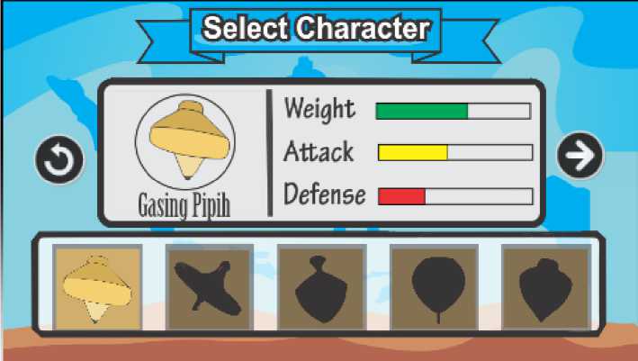 Select Character pada Gambar 4 berisikan 5 buah karakter dari gasing yang memiliki kekuatan (Power), serangan (Attcak) dan pertahanan (Defense) yang berbeda-beda. Kekuatan dari masing-masing gasing dibuat berbeda-beda agar terdapat berbagai pilihan untuk melawan karakter dari musuh.