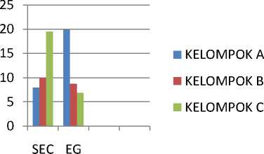 Berdasarkan analisis deskriptif yang disajikan pada gambar di atas, dapat dilihat bahwa nilai rerata dan simpang baku SEC pada kelompok A sebesar 7,96 ± 2,218, kelompok B sebesar 9,96 ± 2,218, kelompok C sebesar 19,54 ± 2,860. Nilai rerata dan simpang baku EG pada kelompok A sebesar 19,88 ± 2,875, kelompok B sebesar 8,73 ± 1,564, kelompok C sebesar 6,85 ± 2,327.