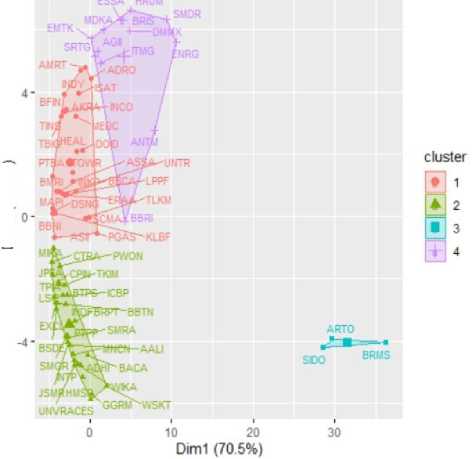 Pengelompokan saham dengan K-Means dimulai dengan menentukan 4 centorid secara acak. Kemudian masing-masing objek dikelompokkan berdasarkan jarak terdekat dengan centorid. Selanjutnya dihitung centorid baru dan diulangi sampai centroid tidak berpindah atau stabil. Hasil pengelompokan dengan menggunakan K-Means dapat dilihat pada Gambar 2.