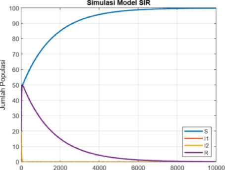 Selanjutnya akan dilakukan simulasi numerik pada titik ekuilibrium bebas penyakit E0 = (S = 100, I1 = 0, I2 = 0,R = 0) dengan menggunakan bantuan software Matlab berdasarkan nilai parameter pada tabel 3 dan sebarang nilai awal S(0) = 50 ,I1(0) = 8 ,I2(0) = 22 ,R(0) = 20 disajikan gambar sebagai berikut: