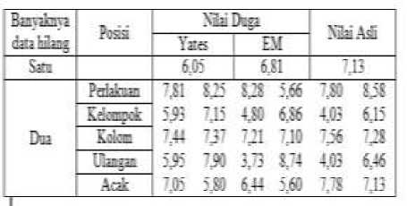 Berdasarkan Tabel 1 tampak bahwa pada saat data lengkap nilai JKG sebesar 11,6409 sedangkan saat terdapat satu data hilang nilai JKG sebesar 27,90802. Hal ini menunjukkan bahwa hilangnya data menyebabkan nilai JKG lebih besar daripada nilai JKG pada analisis ragam data lengkap. Oleh karena itu, dilakukan pendugaan terhadap data hilang tersebut. Pendugaan data hilang dalam penelitian ini menggunakan metode Yates dan algoritma EM.