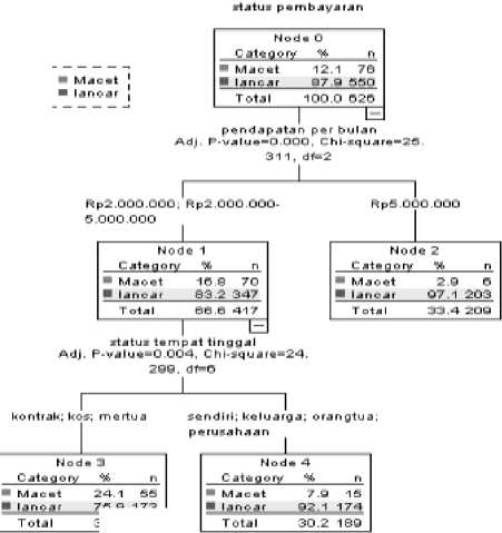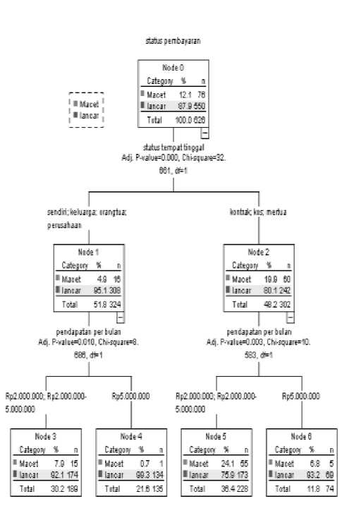 Gambar 1 menunjukkan bahwa dari 626 sampel yang diteliti, hasil yang didapatkan adalah nasabah dengan status lancar sebanyak 550 orang (87,9%) dan nasabah dengan status macet sebanyak 76 orang (12,1%). Variabel pendapatan per bulan ( ^8 ) adalah variabel prediktor yang paling signifikan, sehingga variabel tersebut dipilih sebagai variabel penyekat. Variabel pendapatan per bulan ( ^8) disekat menjadi 2 simpul, yaitu simpul ke-1 dengan kategori nasabah yang memiliki pendapatan per bulan <Rp2.000.000 dan Rp2.000.000-Rp5.000.000 menjadi satu simpul, dan simpul ke-2 dengan kategori nasabah yang memiliki pendapatan per bulan >Rp5.000.000 menjadi satu simpul. Pada simpul ke-1 proses penyekatan dilanjutkan dan menjadi simpul dalam, karena variabel status tempat tinggal (X4) merupakan variabel prediktor kedua yang signifikan untuk membagi kategori pada simpul ke-1. Sementara pada simpul ke-2 proses penyekatan dihentikan karena semua kasus yang terdapat di dalam simpul memiliki nilai-nilai identik untuk tiap variabel prediktor, sehingga simpul ke-2 menjadi simpul akhir.