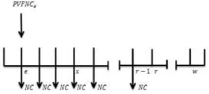 Present value of future normal cost (PVFNC) adalah nilai sekarang dari iuran normal yang dibayarkan secara berkala oleh peserta dimulai dari peserta berusia x tahun sampai memasuki usia pensiun berusia r– 1 tahun, yang dinotasikan dengan r(PVFNC)x. Besar pembayaran berkala iuran normal yang dilakukan setiap awal tahun sebesar NC dimulai dari peserta masuk program pensiun (usia a tahun) sampai memasuki usia pensiun selang waktu usia r-1 tahun dapat dijelaskan dengan skema pembayaran tampak pada Gambar 2.