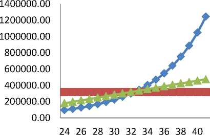 Sedangkan Grafik garis berbentuk persegi tiga yang ditunjukkan pada gambar 4 menunjukkan, bahwa pembiayaan iuran normal dengan menggunakan formula baru dengan kenaikan yang terjadi secara konstan. Hal ini disebabkan karena kenaikan iuran normal yang terjadi setiap tahunnya adalah sebesar α. Dimana dengan menggunakan formula ini didapatkan iuran normal yang harus dibayarkan peserta pensiun saat baru memasuki program dana pensiun sampai akhir usia pembayaran (satu tahun sebelum usia pensiun) berada di tengah-tengah atau diantara perhitungan iuran normal dengan mengunakan perhitungan dengan metode Projected Unit Credit dan Individual Level Premium.