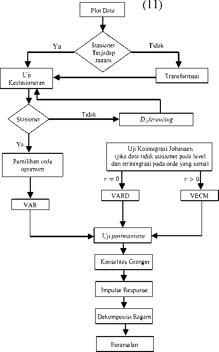 dengan vektor Yt=(Yit, Y2t,…,Yκt)′ adalah vektor variabel endogen berukuran K×1, Φi adalah matriks koefisien berukuran K×K, vektor μ=(kl , μ2,…,PrK)′ adalah vektor intersep K×1, dan vektor