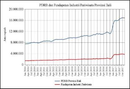 Selain sebagai sumber pendapatan devisa, pariwisata juga memberikan kontribusi untuk penciptaan lapangan kerja, kegiatan produksi dan pendapatan nasional (PDB), pertumbuhan sektor swasta dan pembangunan infrastruktur. Meskipun beragam kontribusi pariwisata terhadap perekonomian telah disadari sejak lama namun sejauh ini penelit ian tentang pengaruh pariwisata terhadap pertumbuhan ekonomi belum mendapatkan porsi yang cukup besar, sehingga sulit menentukan arah hubungan antar kedua variabel. Berdasarkan fakta tersebut, studi ini ingin menganalisis hubungan antara jumlah wisman, jumlah kunjungan wisnus, dan pendapatan industri pariwisata terhadap PDRB Provinsi Bali dan meramalkan nilai PDRB Provinsi Bali periode Juli 2017—Desember 2017.