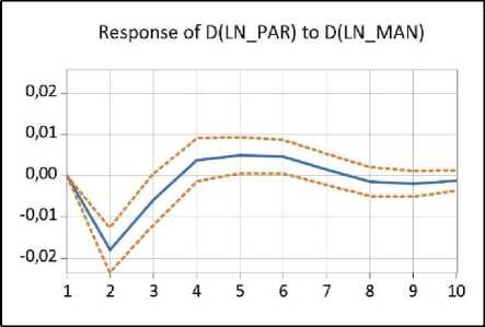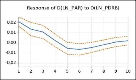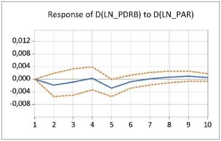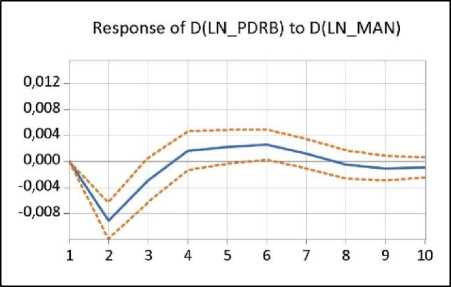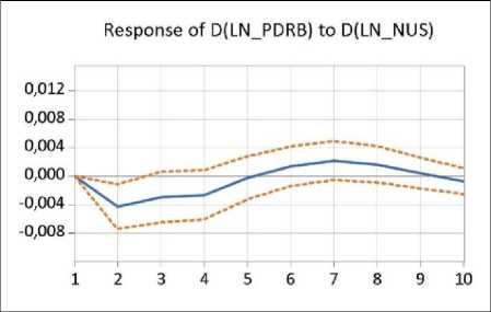 Karena masing–masing nilai koefisien dari estimasi model VAR terkadang sulit untuk dinterpretasikan, maka digunakan impulse response function (IRF). IRF menelusuri respon dari variabel dependen dalam sistem VAR terhadap guncangan (shock) dalam error (ut) dan mengamati dampak dari gunc(a8n)gan tersebut untuk beberapa periode ke depan.