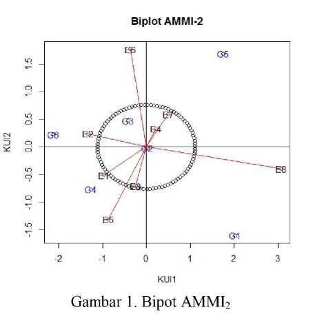 Biplot AMMI2 dari analisis AMMI dapat digunakan untuk melihat genotipe-genotipe yang stabil pada seluruh lokasi percobaan. Dalam membantu melihat genotipe-genotipe yang stabil digunakan daerah kepercayaan elips pada biplot dengan titik pusat (0,0). Penentuan stabilitas genotipe digunakan dua nilai KUI dengan keragaman terbesar pertama dan kedua, hal ini dikarenakan gambaran biplot hanya terbatas pada dua dimensi. Kontribusi keragaman yang diberikan dari dua nilai KUI yang digunakan cukup tinggi yaitu sebesar 77,39%. Menurut Trisnayanti, et al (2015), hal ini sudah melebihi 50% atau sudah lebih dari cukup untuk dapat menentukan stabilitas genotipe.