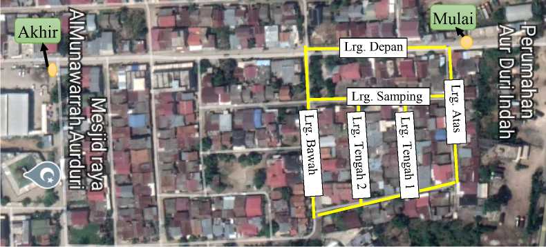 Penelitian dilakukan di Perumahan Aur Duri Indah, Blok B, Rt.14, Kec. Telanai Pura, Kota Jambi, dengan visualisasi perumahan ditampilkan pada Gambar 2. Pengukuran jarak dilakukan dengan aplikasi Maps Ruler.