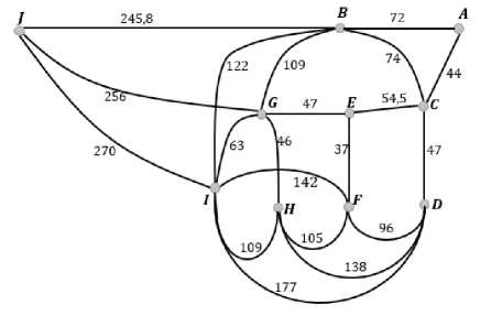 Pada penelitian ini, untuk memodelkan permasalahan ke dalam bentuk graf, diasumsikan ruas jalan di kompleks tersebut sebagai verteks pada graf. Kemudian diasumsikan pula keterhubungan antara ruas jalan pada kompleks itu sebagai sisi pada graf. Graf yang dibentuk adalah graf berbobot, dimana setiap sisinya diberi bobot berdasarkan jarak antara ruas jalan (dengan satuan meter). Dengan demikian model grafnya adalah sebagaimana yang ditampilkan pada Gambar 4, dengan verteks A merepresentasikan tempat berangkat petugas dan verteks J tujuan TPS, sedangkan verteks B,C,D,E,F,G,H,I adalah ruas jalan yang harus dilalui petugas.
