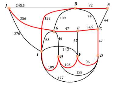 Dengan demikian telah diperoleh sebuah lintasan Hamilton A-B-I-H-F-D-C-E-G-J , sebagaimana yang ditampilkan pada Gambar 5. Rute traversal ini diilustrasikan dengan garis berwarna merah.