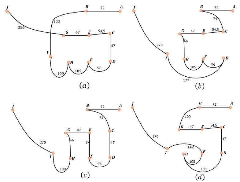 Lintasan ini bukan satu-satunya lintasan Hamilton yang bisa dibentuk dari graf Gambar 4. Dengan prosedur teknis DFS yang sama, diperoleh 39 lintasan Hamilton yang berbeda untuk graf Gambar 4. Beberapa visualisasi lintasan Hamilton yang bisa dibentuk dari graf Gambar 4 ditampilkan pada Gambar 6. Dan total jarak untuk masing-masing lintasan Hamilton ditampilkan pada Tabel 1.