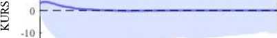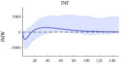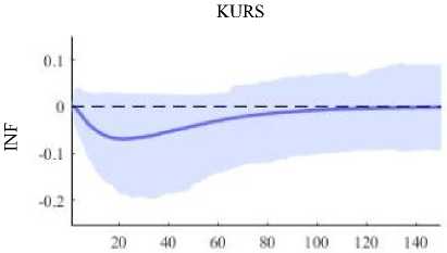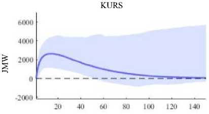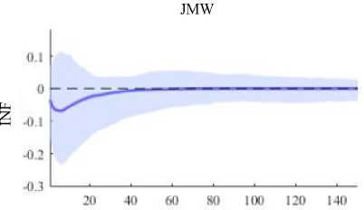 Fungsi respon impuls yang digambarkan dalam bentuk grafik dapat digunakan untuk mengetahui perilaku setiap variabel atas perubahan yang terjadi pada variabel lain dalam sistem. Berikut plot IRF dari JMW, INF, dan KURS.