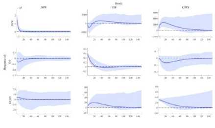 Gambar 4. menunjukkan plot IRF dari ketiga variabel endogen model BVAR yang ditampilkan secara bersamaan sehingga dapat dilihat hubungan dinamis antara masing-masing variabel endogen dari model BVAR pada penelitian ini. Pembahasan lebih lanjut tentang masing-masing plot IRF pada Gambar 4. akan dijelaskan dengan Gambar 5. sampai Gambar 10.