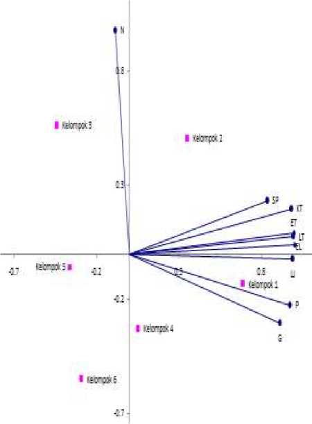 Dari hasil analisis biplot, diperoleh enam kelompok mi instan dengan peubah penciri yang yang berbeda.