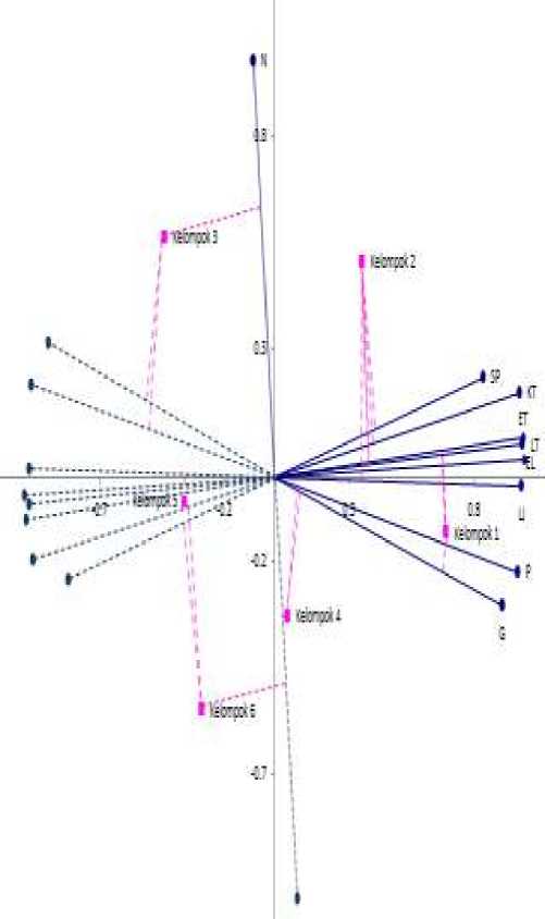 Analisis biplot merupakan salah satu teknik peubah ganda yang menyajikan plot pengamatan n dan peubah p secara bersamaan dalam bidang dua dimensi (Jollife, I.T. 2002). Penyajian plot pengamatan n dan peubah p secara bersamaan dapat memberikan tambahan informasi yang lebih baik tentang hubungan antara peubah dan pengamatan.