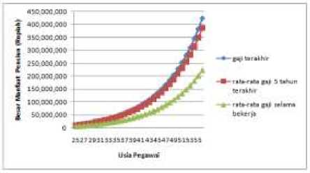 Gambar 3 menunjukkan bahwa penggunaan asumsi gaji terakhir menghasilkan manfaat pensiun yang paling tinggi. Hal ini berarti bahwa penggunaan skala gaji terakhir akan menimbulkan biaya yang paling tinggi dibandingkan dengan penggunaan asumsi gaji yang lain, mengingat gaji pegawai selalu meningkat tiap tahun dan gaji terakhir merupakan gaji tertinggi yang diperoleh pegawai. Selain itu, penggunaan asumsi gaji terakhir dapat merugikan bagi perusahaan karena harus membayar kekurangan