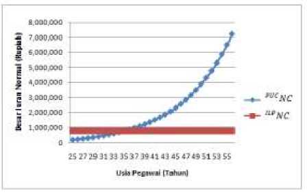 credit terus meningkat setiap tahunnya yang ditunjukkan dengan grafik garis yang berwarna biru sedangkan grafik dengan garis berwarna merah menunjukkan pembiayaan iuran normal dengan metode individual level premium yang cenderung tetap selama bekerja sampai memasuki usia pensiun, hal ini disebabkan karena perhitungan pembiayaan iuran normal dengan metode individual level premium tidak dipengaruhi oleh usia peserta saat tahun perhitungan aktuaria (saat peserta berusia x tahun), namun hanya dipengaruhi oleh usia peserta saat memasuki program pensiun (saat peserta berusia e tahun). Pada awal tahun masuk program pensiun sampai peserta berusia 35 tahun, perhitungan pembiayaan iuran normal dengan metode individual level premium lebih tinggi dibandingkan dengan metode projected unit credit. Sedangkan perhitungan pembiayaan iuran normal saat peserta berusia 36 tahun sampai memasuki usia pensiun dengan metode projected unit credit jauh lebih tinggi dibandingkan dengan perhitungan pembiayaan iuran normal dengan metode individual level premium dengan besar manfaat pensiun yang sama untuk kedua metode tersebut.