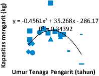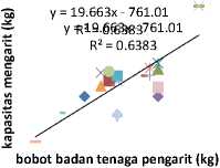 tersebut dapat diambil kesimpulan berupa satu tenaga pengarit bertanggung jawab terhadap 7.02 ST dengan Y = 32,23x - 25,21; R² = 0,552. Banyaknya kapasitas mengarit meningkat seiring besar berat badan pengarit dengan setiap kenaikan bobot badan tenaga pengarit sebesar 1 kg meningkatkan menaikkan kapasitas mengarit sebesar 19.663 kg. Berdasarkan umur tenaga pengarit, kapasitas mengarit tertinggi berada pada umur 38 tahun dengan kapasitas mengarit sebesar 395 kg/hari dan pengalaman mengarit cenderung meningkatkan banyak kapasitas mengarit.