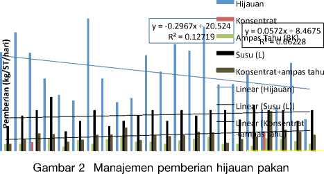 Pemberian hijauan cenderung menurun seiring dengan banyaknya jumlah kepemilikan satuan ternak (Gambar 2).Hal ini disebabkan oleh keterbatasan peternak dalam mengarit.Peternak cenderung mengkonpensasi kekurangan hijauan dengan konsentrat dan ampas tahu.Konsentrat memiliki zat makanan utama (protein, lemak, karbohidrat) yang diharapkan dapat memenuhi kebutuhan ternak. penambahan konsentrat terhadap sapi perah dara pada usaha peternakan rakyat secara efektif meningkatkan pertambahan berat badan dan mempercepat umur pubertas ternak (Mariyono et al.1995)
