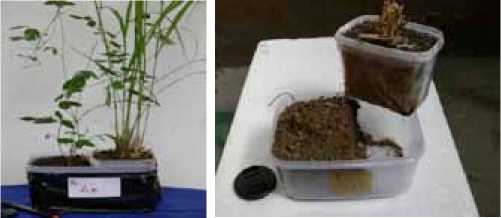 Percobaan ini menggunakan dua tipe pot yaitu A (ukuran 19 × 12× 9 cm) dan B (ukuran12 × 8× 9 cm). Pada salah satu bidang memanjang pot B dibuat lubang berukuran 10 × 7 cm yang kemudian ditutup dengan pembatas nilon (Lampiran 8, Gambar a). Pot B diisi dengan tanah dari lahan percobaan lapangan yang telah dipasteurisasi, kemudian dimasukkan ke dalam pot A dengan bagian pembatas nilon menghadap ke dalam. Setelah pot B berada di dalam pot A, tanah pasteurisasi diisikan ke dalam pot A. Selanjutnya, pot A ditanami legum sesuai dengan perlakuan, yaitu tanpa legum, Sentro, Kudzu dan Siratro.
