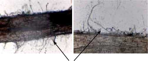 3. Pertumbuhan hifa pada akar tanaman rumput Benggala yang diinokulasi FMA dan menembus pembatas nilon (nylon screen).